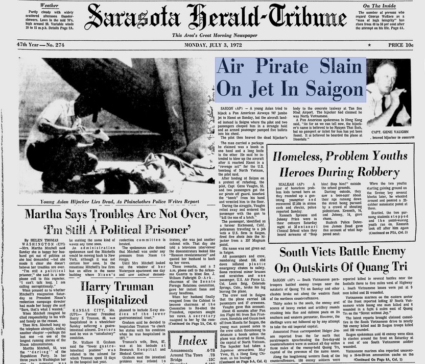 Vào ngày 2 tháng 7 năm 1972, khi chiếc máy bay mang số hiệu 841 của hãng hàng không Mỹ Pan America đang bay chặng cuối cùng từ Manila, Philippines tới sân bay Tân Sơn Nhứt, Sài Gòn, nước Cộng Hòa Việt Nam qua hành trình đầu tiên từ San Francisco, Hoa Kỳ, quá cảnh tại các sân bay Honolulu và Guam, thì bị cướp máy bay. Trên máy bay có 134 hành khách (trong đó có một trẻ em) và 17 nhân viên phi hành đoàn.1 Khi chỉ còn gần mấy chục phút trước khi máy bay hạ cánh xuống phi trường Tân Sơn Nhứt, một người thanh niên đã khống chế cô tiếp viên May Yuen bằng một con dao bấm dài khoảng 25 cm và một gói giấy được nói là bom, đe dọa cho nổ máy bay2 nếu không chuyển hướng bay đi Hà Nội, nước Việt Nam Dân Chủ Cộng Hòa.