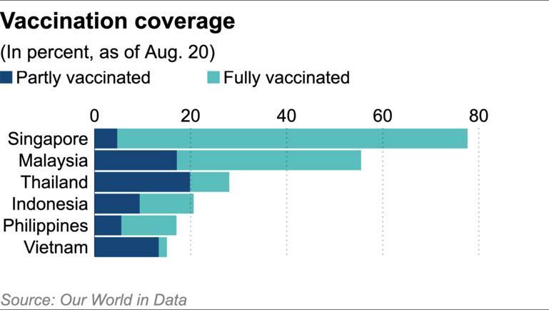 Việt Nam vẫn là nước tụt hậu trong chiến dịch tiêm chủng phòng chống COVID-19 trong khu vực. Tỷ lệ người được tiêm chủng mũi đầu tiên tại Việt Nam là 15%.