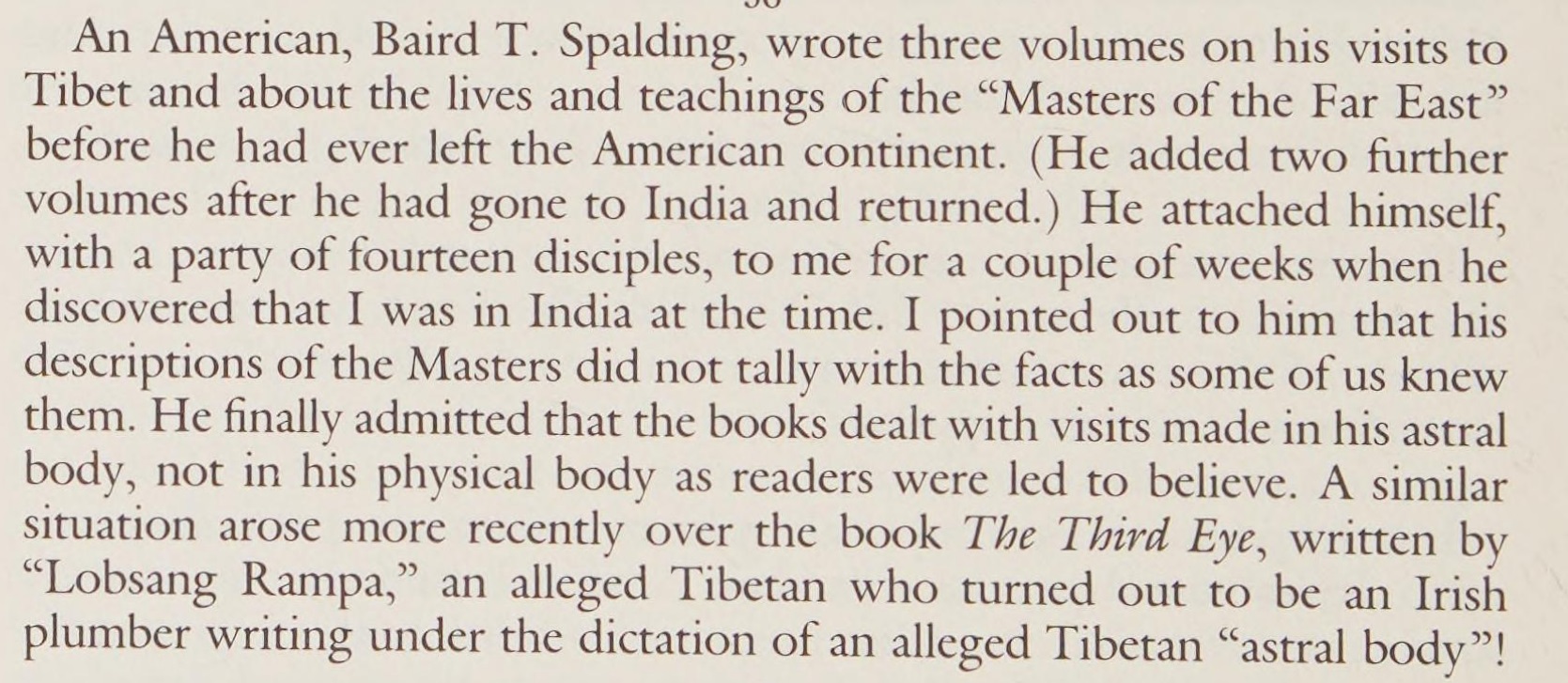 Không một khẳng định nào có giá trị hơn khẳng định của Paul Brunton về cuộc thám hiểm Ấn Độ không có thật, chứng minh cuốn sách của Baird T. Spalding được viết do tưởng tượng. Paul Brunton, người đã gặp trực tiếp Baird T. Spalding, phỏng vấn và ghi lại trong cuốn sách của mình. Brunton là một nhà nghiên cứu tâm linh nổi tiếng, là người đầu tiên gặp Bậc Thầy Ramana Maharshi tại Ấn Độ, nhờ vậy mà phương Tây mới biết đến Bậc Thầy Ramana Maharshi nổi tiếng. Baird T. Spalding đã thừa nhận với Brunton cuốn sách đã viết về cuộc thám hiểm được thực hiện bằng phần hồn của ông, chứ không phải phần xác của ông như độc giả vẫn tin10. [He finally admitted that the books dealt with visits made in his astral body, not in his physical body as readers were led to believe].