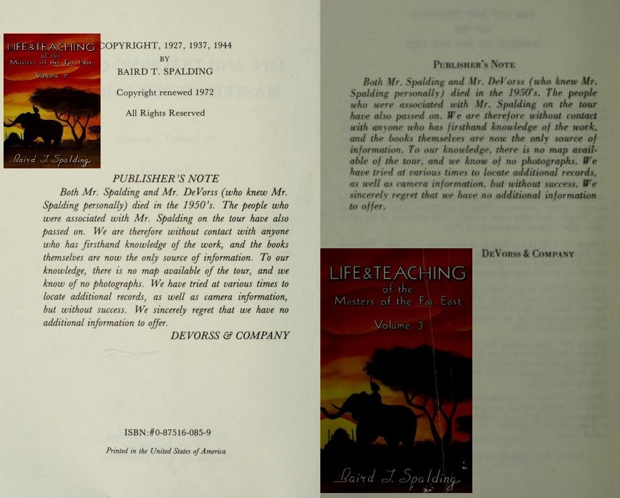 Một điều đáng chú ý là sau khi cả hai qua đời, các cuốn sách xuất bản sau này đều được nhà xuất bản DeVorss cáo lỗi với bạn đọc với ghi chú rằng nhà xuất bản không có bất cứ một hình ảnh hay một bản đồ hay một thông tin nào ngoài bản thân cuốn sách. Baird T. Spalding, Douglas DeVorss và những người có lien quan đến cuộc thám hiểm của Baird T. Spalding đều đã qua đời nên nhà xuất bản không hề có bất kỳ một thông tin nào khác. Vậy là độc giả phải tự kết luận cho riêng mình về cuộc thám hiểm thực sự có thật hay không?